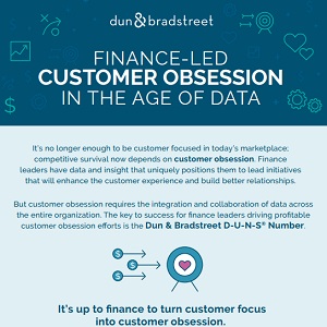 It is no longer enough to be customer focused in today's marketplace; competitive survival now depends on customer obsession. Finance leaders have data and insight that uniquely positions them to lead initiatives that will enhance the customer experience and build better relationships. But customer obsession requires the integration and collaboration of data across the entire organization. The key to success for finance leaders driving profitable customer obsession efforts is the Dun & Bradstreet D-U-N-S Number. Download this infographic to learn more.
